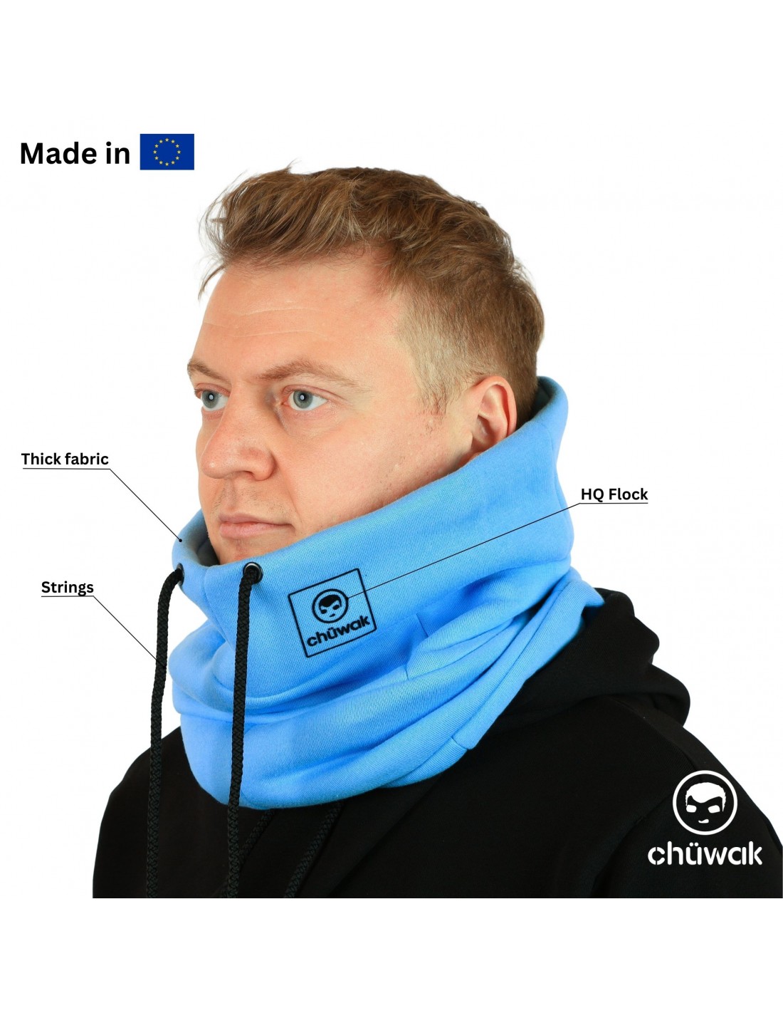 Šilta ir stilinga kaklo mova. Susideda iš 90% medvilnės ir 10% poliesterio. Užveržimas viršuje - virvute. Spalva: Mėlyna. Medžiagos atitinka Oeko-tex100 standartą. Tinka tiek vyrams, tiek moterims. Logotipas - flokas.